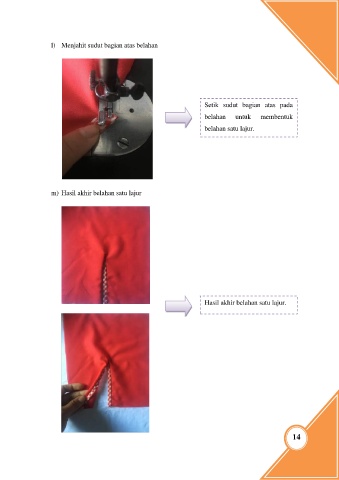 l) Menjahit sudut bagian atas belahan Setik sudut bagian atas pada belahan untuk membentuk belahan satu lajur. m) Hasil akhir belahan satu lajur Hasil akhir belahan satu lajur. 14