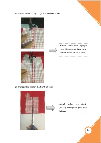 f) Menjahit belahan bagian lajur atas dan lajur bawah