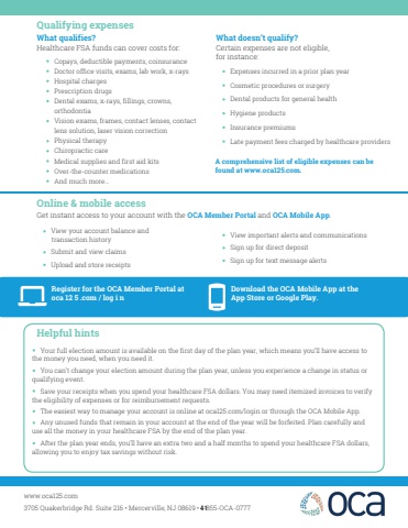 View your account balance andtransaction historySubmit and view claimsUpload and store receiptsCopays, deductible payments, coinsuranceDoctor office visits, exams, lab work, x-raysHospital chargesPrescription drugsDental exams, x-rays, fillings, crowns,orthodontiaVision exams, frames, contact lenses, contactlens solution, laser vision correctionPhysical therapyChiropractic careMedical supplies and first aid kitsOver-the-counter medicationsAnd much more%u2026www.oca125.com3705 Quakerbridge Rd. Suite 216 %u2022 Mercerville, NJ 08619 %u2022 1-855-OCA-0777Expenses incurred in a prior plan yearCosmetic procedures or surgeryDental products for general healthHygiene productsInsurance premiumsLate payment fees charged by healthcare providersView important alerts and communicationsSign up for direct depositSign up for text message alertsYour full election amount is available on the first day of the plan year, which means you%u2019ll have access tothe money you need, when you need it.You can%u2019t change your election amount during the plan year, unless you experience a change in status orqualifying event.Save your receipts when you spend your healthcare FSA dollars. You may need itemized invoices to verifythe eligibility of expenses or for reimbursement requests.The easiest way to manage your account is online at oca125.com/login or through the OCA Mobile App.Any unused funds that remain in your account at the end of the year will be forfeited. Plan carefully anduse all the money in your healthcare FSA by the end of the plan year.After the plan year ends, you%u2019ll have an extra two and a half months to spend your healthcare FSA dollars,allowing you to enjoy tax savings without risk.Helpful hintsQualifying expensesWhat qualifies?Healthcare FSA funds can cover costs for:Online & mobile accessGet instant access to your account with the OCA Member Portal and OCA Mobile App.What doesn%u2019t qualify?Certain expenses are not eligible,for instance:Register for the OCA Member Portal atoca 12 5 .com / log i nDownload the OCA Mobile App at theApp Store or Google Play.A comprehensive list of eligible expenses can befound at www.oca125.com.41