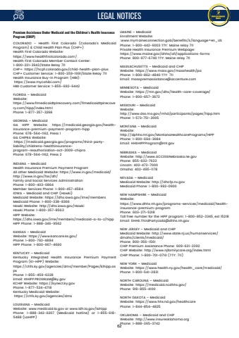 LEGAL NOTICESPremium Assistance Under Medicaid and the Children%u2019s Health InsuranceProgram (CHIP)COLORADO - Health First Colorado (Colorado%u2019s MedicaidProgram) & Child Health Plan Plus (CHP+)Health First Colorado Website:https://www.healthfirstcolorado.com/Health First Colorado Member Contact Center:1-800-221-3943/State Relay 711CHP+: https://hcpf.colorado.gov/child-health-plan-plusCHP+ Customer Service: 1-800-359-1991/State Relay 711Health Insurance Buy-In Program (HIBI): https://www.mycohibi.com/HIBI Customer Service: 1-855-692-6442FLORIDA %u2013 MedicaidWebsite:https://www.flmedicaidtplrecovery.com/flmedicaidtplrecovery.com/hipp/index.htmlPhone: 1-877-357-3268GEORGIA %u2013 MedicaidGA HIPP Website: https://medicaid.georgia.gov/healthinsurance-premium-payment-program-hippPhone: 678-564-1162, Press 1GA CHIPRA Website::https://medicaid.georgia.gov/programs/third-partyliability/childrens-healthinsuranceprogram-reauthorization-act-2009-chipraPhone: 678-564-1162, Press 2INDIANA %u2013 MedicaidHealth Insurance Premium Payment ProgramAll other Medicaid Website: https://www.in.gov/medicaid/http://www.in.gov/fss/dfr/Family and Social Services AdministrationPhone: 1-800-403-0864Member Services Phone: 1-800-457-4584IOWA %u2013 Medicaid and CHIP (Hawki)Medicaid Website: https://dhs.iowa.gov/ime/membersMedicaid Phone: 1-800-338-8366Hawki Website: http://dhs.iowa.gov/HawkiHawki Phone: 1-800-257-8563HIPP Website:https://dhs.iowa.gov/ime/members/medicaid-a-to-z/hippHIPP Phone: 1-888-346-9562KANSAS %u2013 MedicaidWebsite: https://www.kancare.ks.gov/Phone: 1-800-792-4884HIPP Phone: 1-800-967-4660KENTUCKY %u2013 MedicaidKentucky Integrated Health Insurance Premium PaymentProgram (KI-HIPP) Website:https://chfs.ky.gov/agencies/dms/member/Pages/kihipp.aspxPhone: 1-855-459-6328Email: KIHIPP.PROGRAM@ky.govKCHIP Website: https://kynect.ky.govPhone: 1-877-524-4718Kentucky Medicaid Website:https://chfs.ky.gov/agencies/dmsLOUISIANA %u2013 MedicaidWebsite: www.medicaid.la.gov or www.ldh.la.gov/lahippPhone: 1-888-342-6207 (Medicaid hotline) or 1-855-618-5488 (LaHIPP)LMAINE %u2013 MedicaidEnrollment Website::www.mymaineconnection.gob/benefits/s/language=en_USPhone: 1-800-442-6003 TTY: Maine relay 711Private Health Insurance Premium Webpage:https://www.maine.gov/dhhs/ofi/applications-formsPhone: 800-977-6740 TTY: Maine relay 711MASSACHUSETTS %u2013 Medicaid and CHIPWebsite: https://www.mass.gov/masshealth/paPhone: 1-800-862-4840 TTY: 711Email: masspremassistance@accenture.comMINNESOTA %u2013 MedicaidWebsite: https://mn.gov/dhs/health-care-coverage/Phone: 1-800-657-3672MISSOURI %u2013 MedicaidWebsite:http://www.dss.mo.gov/mhd/participants/pages/hipp.htmPhone: 1-573-751-2005MONTANA %u2013 MedicaidWebsite:http://dphhs.mt.gov/MontanaHealthcarePrograms/HIPPPhone: 1-800-694-3084Email: HHSHIPPProgram@mt.govNEBRASKA %u2013 MedicaidWebsite: http://www.ACCESSNebraska.ne.govPhone: 855-632-7633Lincoln: 402-473-7000Omaha: 402-495-1178NEVADA %u2013 MedicaidMedicaid Website: http://dhcfp.nv.govMedicaid Phone: 1-800-992-0900NEW HAMPSHIRE %u2013 MedicaidWebsite:https://www.dhhs.nh.gov/programs-services/medicaid/healthinsurance-premium-programPhone: 603-271-5218Toll free number for the HIPP program: 1-800-852-3345, ext 15218Email: DHHS.ThirdPartyLiabi@dhhs.nh.govNEW JERSEY %u2013 Medicaid and CHIPMedicaid Website: http://www.state.nj.us/humanservices/dmahs/clients/medicaid/Phone: 800-356-1561CHIP Premium Assistance Phone: 609-631-2392CHIP Website: http://www.njfamilycare.org/index.htmlCHIP Phone: 1-800-701-0710 (TTY: 711)NEW YORK %u2013 MedicaidWebsite: https://www.health.ny.gov/health_care/medicaid/Phone: 1-800-541-2831NORTH CAROLINA %u2013 MedicaidWebsite: https://medicaid.ncdhhs.gov/Phone: 919-855-4100NORTH DAKOTA %u2013 MedicaidWebsite: https://www.hhs.nd.gov/healthcarePhone: 1-844-854-4825OKLAHOMA %u2013 Medicaid and CHIPWebsite: http://www.insureoklahoma.orgPhone: 1-888-365-374262