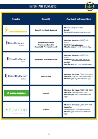 Carrier Benefit Contact InformationBenefit Service & SupportPhone: (732) 704-7633Email:Service@thecacompanies.comMedical InsurancePharmacy BenefitsHospital & Provider SearchMember Services: (866) 801-4409Website: myuhc.comMobile App: My UHC Mobile AppHospital & Provider SearchMember Services: (866) 801-4409Website: myuhc.com/find-adoctorMobile App: My UHC Mobile AppVirtual CareMember Services: (855) 615-8335Website: myuhc.com/virtualvisitsMobile App: My UHC Mobile AppDentalMember Services: (800) 452-9310Website: deltadentalnj.comMobile App: Delta Dental MobileAppVisionMember Services: (800) 877-7195Website:deltadentalnj.com/DeltaVisionMobile App: Delta Dental MobileAppIMPORTANT CONTACTS3