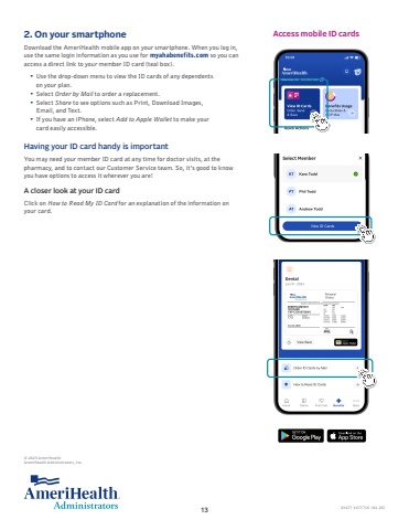 23477 3477715 (03-25)%u00a9 2025 AmeriHealthAmeriHealth Administrators, Inc.2. On your smartphoneDownload the AmeriHealth mobile app on your smartphone. When you log in, use the same login information as you use for myahabenefits.com so you can access a direct link to your member ID card (teal box).%u2022 Use the drop-down menu to view the ID cards of any dependents on your plan.%u2022 Select Order by Mail to order a replacement.%u2022 Select Share to see options such as Print, Download Images, Email, and Text.%u2022 If you have an iPhone, select Add to Apple Wallet to make your card easily accessible.Having your ID card handy is importantYou may need your member ID card at any time for doctor visits, at the pharmacy, and to contact our Customer Service team. So, it%u2019s good to know you have options to access it wherever you are!A closer look at your ID cardClick on How to Read My ID Card for an explanation of the information on your card.Access mobile ID cards13