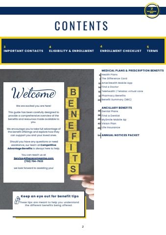 %u00a0 %u00a0Keep an eye out for benefit tipsThese tips are meant to help you understandthe different benefits being offered.671214151720263840424654C O N T E N T S%u00a0 %u00a0MEDICAL PLANS & PRESCRIPTION BENEFITSHealth PlansThe Difference CardAmeriHealth Mobile AppFind a DoctorTelehealth | Teladoc virtual carePharmacy BenefitsBenefit Summary (SBC)ANCILLARY BENEFITSDental PlansFind a DentistMySmile Mobile ApVision PlanLife InsuranceANNUAL NOTICES PACKET4%u00a0ENROLLMENT CHECKLIST4ELIGIBILITY & ENROLLMENT3IMPORTANT CONTACTSWe are excited you are here!This guide has been carefully designed toprovide a comprehensive overview of thebenefits and resources made available toyou.We encourage you to take full advantage ofthe benefit offerings and explore how theycan support you and your loved ones.Should you have any questions or needassistance, our team at CompetitiveAdvantage Benefits is always here to help.You can reach us atService@thecacompanies.com(732) 704-7633we look forward to assisting you!5 %u00a0 %u00a0TERMS2