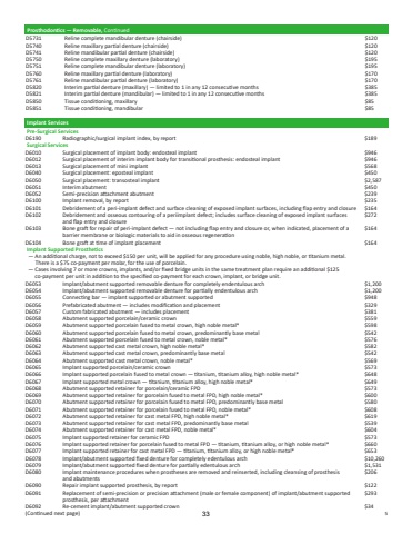 Prosthodontics %u2014 Removable, ContinuedD5731 Reline complete mandibular denture (chairside) $120D5740 Reline maxillary partial denture (chairside) $120D5741 Reline mandibular partial denture (chairside) $120D5750 Reline complete maxillary denture (laboratory) $195D5751 Reline complete mandibular denture (laboratory) $195D5760 Reline maxillary partial denture (laboratory) $170D5761 Reline mandibular partial denture (laboratory) $170D5820 Interim partial denture (maxillary) %u2014 limited to 1 in any 12 consecutive months $385D5821 Interim partial denture (mandibular) %u2014 limited to 1 in any 12 consecutive months $385D5850 Tissue conditioning, maxillary $85D5851 Tissue conditioning, mandibular $85Implant Services Pre-Surgical ServicesD6190 Radiographic/surgical implant index, by report $189 Surgical ServicesD6010 Surgical placement of implant body: endosteal implant $946D6012 Surgical placement of interim implant body for transitional prosthesis: endosteal implant $946D6013 Surgical placement of mini implant $568D6040 Surgical placement: eposteal implant $450D6050 Surgical placement: transosteal implant $2,587D6051 Interim abutment $450D6052 Semi-precision attachment abutment $239D6100 Implant removal, by report $235D6101 Debridement of a peri-implant defect and surface cleaning of exposed implant surfaces, including flap entry and closure $164D6102 Debridement and osseous contouring of a periimplant defect; includes surface cleaning of exposed implant surfaces and flap entry and closure$272D6103 Bone graft for repair of peri-implant defect %u2014 not including flap entry and closure or, when indicated, placement of a barrier membrane or biologic materials to aid in osseous regeneration$164D6104 Bone graft at time of implant placement $164 Implant Supported Prosthetics %u2014 An additional charge, not to exceed $150 per unit, will be applied for any procedure using noble, high noble, or titanium metal. There is a $75 co-payment per molar, for the use of porcelain. %u2014 Cases involving 7 or more crowns, implants, and/or fixed bridge units in the same treatment plan require an additional $125 co-payment per unit in addition to the specified co-payment for each crown, implant, or bridge unit.D6053 Implant/abutment supported removable denture for completely endentulous arch $1,200D6054 Implant/abutment supported removable denture for partially endentulous arch $1,200D6055 Connecting bar %u2014 implant supported or abutment supported $948D6056 Prefabricated abutment %u2014 includes modification and placement $329D6057 Custom fabricated abutment %u2014 includes placement $381D6058 Abutment supported porcelain/ceramic crown $559D6059 Abutment supported porcelain fused to metal crown, high noble metal* $598D6060 Abutment supported porcelain fused to metal crown, predominantly base metal $542D6061 Abutment supported porcelain fused to metal crown, noble metal* $576D6062 Abutment supported cast metal crown, high noble metal* $582D6063 Abutment supported cast metal crown, predominantly base metal $542D6064 Abutment supported cast metal crown, noble metal* $569D6065 Implant supported porcelain/ceramic crown $573D6066 Implant supported porcelain fused to metal crown %u2014 titanium, titanium alloy, high noble metal* $648D6067 Implant supported metal crown %u2014 titanium, titanium alloy, high noble metal* $649D6068 Abutment supported retainer for porcelain/ceramic FPD $573D6069 Abutment supported retainer for porcelain fused to metal FPD, high noble metal* $600D6070 Abutment supported retainer for porcelain fused to metal FPD, predominantly base metal $580D6071 Abutment supported retainer for porcelain fused to metal FPD, noble metal* $608D6072 Abutment supported retainer for cast metal FPD, high noble metal* $619D6073 Abutment supported retainer for cast metal FPD, predominantly base metal $539D6074 Abutment supported retainer for cast metal FPD, noble metal* $604D6075 Implant supported retainer for ceramic FPD $573D6076 Implant supported retainer for porcelain fused to metal FPD %u2014 titanium, titanium alloy, or high noble metal* $660D6077 Implant supported retainer for cast metal FPD %u2014 titanium, titanium alloy, or high noble metal* $653D6078 Implant/abutment supported fixed denture for completely edentulous arch $10,260D6079 Implant/abutment supported fixed denture for partially edentulous arch $1,531D6080 Implant maintenance procedures when prostheses are removed and reinserted, including cleansing of prosthesis and abutments$206D6090 Repair implant supported prosthesis, by report $122D6091 Replacement of semi-precision or precision attachment (male or female component) of implant/abutment supported prosthesis, per attachment$293D6092 Re-cement implant/abutment supported crown $34(Continued next page)335