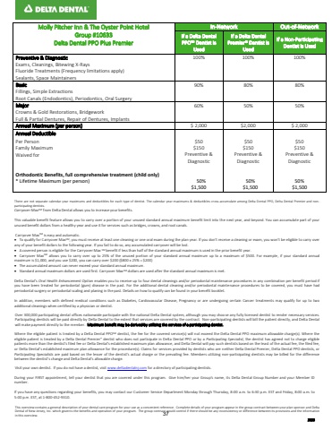 Molly Pitcher Inn & The Oyster Point Hotel Group #10633 Delta Dental PPO Plus Premier In-Network Out-of-Network If a Delta Dental PPO%u2122 Dentist is UsedIf a Delta Dental Premier%u00ae Dentist is Used If a Non-Participating Dentist is Used Preventive & DiagnosticExams, Cleanings, Bitewing X-RaysFluoride Treatments (Frequency limitations apply)Sealants, Space Maintainers100% 100% 100%Basic Fillings, Simple ExtractionsRoot Canals (Endodontics), Periodontics, Oral Surgery90% 80% 80%Major Crowns & Gold Restorations, BridgeworkFull & Partial Dentures, Repair of Dentures, Implants60% 50% 50%Annual Maximum (per person) $ 2,000 $2,000 $ 2,000Annual Deductible Per Person $50 $50 $50Family Maximum $150 $150 $150Waived for Preventive & DiagnosticPreventive & DiagnosticPreventive & DiagnosticOrthodontic Benefits, full comprehensive treatment (child only) * Lifetime Maximum (per person) 50%$1,50050%$1,50050%$1,500There are not separate calendar year maximums and deductibles for each type of dentist. The calendar year maximums & deductibles cross-accumulate among Delta Dental PPO, Delta Dental Premier and nonparticipating dentists.Carryover MaxSM from Delta Dental allows you to increase your benefits.This valuable benefit feature allows you to carry over a portion of your unused standard annual maximum benefit limit into the next year, and beyond. You can accumulate part of your unused benefit dollars from a healthy year and use it for services such as bridges, crowns, and root canals.Carryover MaxSM is easy and automatic.%u2022 To qualify for Carryover MaxSM, you must receive at least one cleaning or one oral exam during the plan year. If you don%u2019t receive a cleaning or exam, you won%u2019t be eligible to carry over any of your benefit dollars to the following year. If you fail to do so, any accumulated carryover will be lost.%u2022 A covered person is eligible for the Carryover Max SM benefit if less than half of the standard annual maximum is used in the prior benefit year.%u2022 Carryover MaxSM allows you to carry over up to 25% of the unused portion of your standard annual maximum up to a maximum of $500. For example, if your standard annual maximum is $1,000, and you use $200, you can carry over $200 ($800 x 25% = $200)%u2022 The accumulated amount can never exceed your standard annual maximum.%u2022 Standard annual maximum dollars are used first. Carryover MaxSM dollars are used after the standard annual maximum is met.Delta Dental%u2019s Oral Health Enhancement Option enables you to receive up to four dental cleanings and/or periodontal maintenance procedures in any combination per benefit period if you have been treated for periodontal (gum) disease in the past. For the additional dental cleaning and/or periodontal maintenance procedures to be covered, you must have had periodontal surgery or periodontal scaling and planing in the past. Details on how to qualify can be found in your benefit booklet.In addition, members with defined medical conditions such as Diabetes, Cardiovascular Disease, Pregnancy or are undergoing certain Cancer treatments may qualify for up to two additional cleanings when certified by a physician or dentist.Over 300,000 participating dental offices nationwide participate with the national Delta Dental system, although you may choose any fully licensed dentist to render necessary services. Participating dentists will be paid directly by Delta Dental to the extent that services are covered by the contract. Non-participating dentists will bill the patient directly, and Delta Dental will make payment directly to the member. Maximum benefit may be derived by utilizing the services of a participating dentist. Where the eligible patient is treated by a Delta Dental PPOSM dentist, the fee for the covered service(s) will not exceed the Delta Dental PPO maximum allowable charge(s). Where the eligible patient is treated by a Delta Dental Premier%u00ae dentist who does not participate in Delta Dental PPO or by a Participating Specialist, the dentist has agreed not to charge eligible patients more than the dentist's filed fee or Delta Dental's established maximum plan allowance, and Delta Dental will pay such dentists based on the least of the actual fee, the filed fee, or Delta Dental%u2019s established maximum plan allowance for the procedure(s). Claims for services provided by dentists who are neither Delta Dental Premier, Delta Dental PPO dentists, or Participating Specialists are paid based on the lesser of the dentist's actual charge or the prevailing fee. Members utilizing non-participating dentists may be billed for the difference between the dentist%u2019s change and Delta Dental%u2019s allowable charge.Visit your own dentist. If you do not have a dentist, visit www.deltadentalnj.com for a directory of participating dentists.During your FIRST appointment, tell your dentist that you are covered under this program. Give him/her your Group's name, its Delta Dental Group Number and your Member ID number.If you have any questions regarding your benefits, you may contact our Customer Service Department Monday through Thursday, 8:00 a.m. to 6:30 p.m. EST and Friday, 8:00 a.m. to 5:00 p.m. EST, at 1-800-452-9310.This overview contains a general description of your dental care program for your use as a convenient reference. Complete details of your program appear in the group contract between your plan sponsor and Delta Dental of New Jersey, Inc. which governs the benefits and operation of your program. The group contract would control if there should be any inconsistency or difference between its provisions and the information in this overview.202537