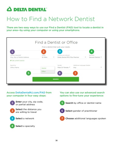 How to Find a Network DentistThere are two easy ways to use our Find a Dentist (FAD) tool to locate a dentist in your area%u2014by using your computer or using your smartphone.Access DeltaDentalNJ.com/FAD from your computer in four easy steps:Select the distance you are willing to travel 2Enter your city, zip code, or partial address 13 Select a network4 Select a specialtyYou can also use our advanced search options to fine-tune your experience:6 Select gender of practitioner5 Search by office or dentist name7 Choose additional languages spoken1 2 3 45 6 738