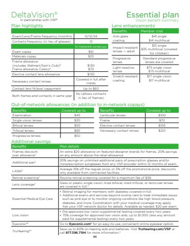 DeltaVision%u00aeIn partnership with VSP%u00aeEssential planVision benefit summaryExam/Lens/Frame frequency (months) 12/12/24Contacts frequency (in lieu of glasses) 12In-network coverageExam copay $10Materials copay $25Frame allowance (includes Walmart/Sam%u2019s Club)*Frame allowance Costco*$130$70Elective contact lens allowance $130Necessary contact lenses Covered in full after copayContact lens fit/eval copayment Up to $60Both frames and contacts in same year No (allows contacts in lieu of frames)Benefits Member costAnti-glarecoating$41 single$41 multifocalImpact-resistant lenses %u2014 adult$31 single$35 multifocal (covered for children)Progressive lensesStandard progressive lenses are coveredLight-reactive lenses$75 single vision$75 multifocalScratch-resistant coating$17 single vision$17 multifocalPlan highlights Lens enhancements1Benefits Covered up toExamination $45Single vision lenses $30Bifocal lenses $50Trifocal lenses $65Progressive lenses $50Out-of-network allowances (in addition to in-network copays)Benefits Covered up toLenticular lenses $100Frame $70Elective contact lenses $105Necessary contact lenses $210Benefits Plan detailsFrames discount over allowance2An extra $20 allowance on featured designer brands for frames. 20% savings on any amount above the retail allowance.Additional pair2 20% savings on unlimited additional pairs of prescription glasses and/or nonprescription sunglasses from any VSP provider within 12 months of exam.LASIK2 Average 15% off the regular price, or 5% off the promotional price; discounts only available from contracted facilities.Retinal screening2 Routine retinal screening covered for a maximum fee of $39.Lens coverage2 Glass or plastic single vision, lined bifocal, lined trifocal, or lenticular lenses are covered in full.3Essential Medical Eye Care%u2022 Retinal imaging for members with diabetes covered-in-full.%u2022 Additional exams and services beyond routine care to treat immediate issues such as pink eye or to monitor ongoing conditions like high blood pressure, diabetes, and more. Coordination with your medical coverage may apply. Ask your VSP network doctor for details. Available as needed. $20 per exam.Low vision%u2022 Pre-approved low vision supplemental testing covered every two years.%u2022 75% coverage for approved low vision aids, up to $1,000 (less any amount paid for supplemental testing) every two years.Eyeconic%u00ae2 Go to Eyeconic.com%u00ae for an easy-to-use, convenient online eyewear option.TruHearing%u00ae2 Save up to 60% on hearing aids and batteries. Visit TruHearing.com/VSP or call 877.396.7194 for more information.4Additional savings44