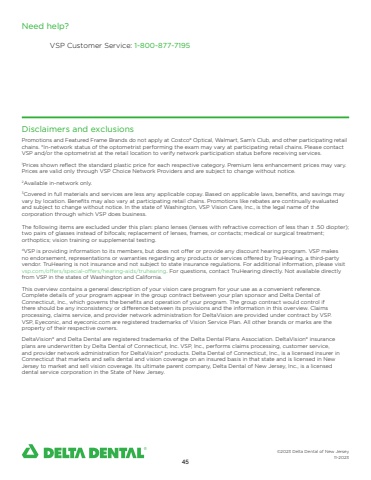 Disclaimers and exclusionsPromotions and Featured Frame Brands do not apply at Costco%u00ae Optical, Walmart, Sam%u2019s Club, and other participating retail chains. *In-network status of the optometrist performing the exam may vary at participating retail chains. Please contact VSP and/or the optometrist at the retail location to verify network participation status before receiving services.1Prices shown reflect the standard plastic price for each respective category. Premium lens enhancement prices may vary. Prices are valid only through VSP Choice Network Providers and are subject to change without notice.2Available in-network only.3Covered in full materials and services are less any applicable copay. Based on applicable laws, benefits, and savings may vary by location. Benefits may also vary at participating retail chains. Promotions like rebates are continually evaluated and subject to change without notice. In the state of Washington, VSP Vision Care, Inc., is the legal name of the corporation through which VSP does business.The following items are excluded under this plan: plano lenses (lenses with refractive correction of less than %u00b1 .50 diopter); two pairs of glasses instead of bifocals; replacement of lenses, frames, or contacts; medical or surgical treatment; orthoptics; vision training or supplemental testing.4VSP is providing information to its members, but does not offer or provide any discount hearing program. VSP makes no endorsement, representations or warranties regarding any products or services offered by TruHearing, a third-party vendor. TruHearing is not insurance and not subject to state insurance regulations. For additional information, please visit vsp.com/offers/special-offers/hearing-aids/truhearing. For questions, contact TruHearing directly. Not available directly from VSP in the states of Washington and California.This overview contains a general description of your vision care program for your use as a convenient reference. Complete details of your program appear in the group contract between your plan sponsor and Delta Dental of Connecticut, Inc., which governs the benefits and operation of your program. The group contract would control if there should be any inconsistency or difference between its provisions and the information in this overview. Claims processing, claims service, and provider network administration for DeltaVision are provided under contract by VSP. VSP, Eyeconic, and eyeconic.com are registered trademarks of Vision Service Plan. All other brands or marks are the property of their respective owners.DeltaVision%u00ae and Delta Dental are registered trademarks of the Delta Dental Plans Association. DeltaVision%u00ae insurance plans are underwritten by Delta Dental of Connecticut, Inc. VSP, Inc., performs claims processing, customer service, and provider network administration for DeltaVision%u00ae products. Delta Dental of Connecticut, Inc., is a licensed insurer in Connecticut that markets and sells dental and vision coverage on an insured basis in that state and is licensed in New Jersey to market and sell vision coverage. Its ultimate parent company, Delta Dental of New Jersey, Inc., is a licensed dental service corporation in the State of New Jersey. Need help?VSP Customer Service: 1-800-877-7195%u00a92023 Delta Dental of New Jersey11-202345