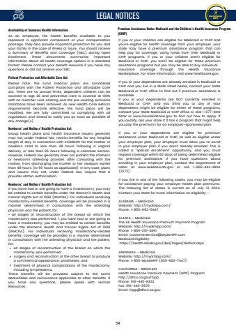 LEGAL NOTICESAvailability of Summary Health InformationAs an employee, the health benefits available to yourepresent a significant component of your compensationpackage. They also provide important protection for you andyour family in the case of illness or injury. You should receivea Summary of Benefits and Coverage (SBC) during OpenEnrollment. These documents summarize importantinformation about all health coverage options in a standardformat. Please contact your benefit resource if you have anyquestions or did not receive your SBC.Patient Protection and Affordable Care ActPlease note: the Fund medical plans are consideredcompliant with the Patient Protection and Affordable CareAct. There are no annual limits, dependent children can becovered to age 26 and preventive care is covered at 100%with no member cost-sharing and the pre-existing exclusionlimitations have been removed. As new Health Care Reformrequirements become effective, the Fund plans will bemodified. We are fully committed to complying with allregulations and intend to notify you as soon as possible ofany change(s).Newborns%u2019 and Mothers' Health Protection ActGroup health plans and health insurance issuers generallymay not, under Federal law, restrict benefits for any hospitallength of stay in connection with childbirth for the mother ornewborn child to less than 48 hours following a vaginaldelivery, or less than 96 hours following a cesarean section.However, Federal law generally does not prohibit the mother'sor newborn's attending provider, after consulting with themother, from discharging the mother or her newborn earlierthan 48 hours (or 96 hours as applicable). In any case, plansand issuers may not, under Federal law, require that aprovider obtain authorization.Newborns%u2019 and Mothers' Health Protection ActIf you have had or are going to have a mastectomy, you maybe entitled to certain benefits under the Women's Health andCancer Rights Act of 1998 (WHCRA). For individuals receivingmastectomy-related benefits, coverage will be provided in amanner determined in consultation with the attendingphysician and the patient, for:%u2022 all stages of reconstruction of the breast on which themastectomy was performed; f you have had or are going tohave a mastectomy, you may be entitled to certain benefitsunder the Women's Health and Cancer Rights Act of 1998(WHCRA). For individuals receiving mastectomy-relatedbenefits, coverage will be provided in a manner determinedin consultation with the attending physician and the patient,for:all stages of reconstruction of the breast on which themastectomy was performed;surgery and reconstruction of the other breast to producea symmetrical appearance; prostheses; andtreatment of physical complications of the mastectomy,including lymphedema.These benefits will be provided subject to the samedeductibles and coinsurance applicable to other benefits. Ifyou have any questions, please speak with HumanResources.Premium Assistance Under Medicaid and the Children%u2019s Health Insurance Program(CHIP)If you or your children are eligible for Medicaid or CHIP andyou%u2019re eligible for health coverage from your employer, yourstate may have a premium assistance program that canhelp pay for coverage, using funds from their Medicaid orCHIP programs. If you or your children aren%u2019t eligible forMedicaid or CHIP, you won%u2019t be eligible for these premiumassistance programs but you may be able to buy individualinsurance coverage through the Health InsuranceMarketplace. For more information, visit www.healthcare.gov.If you or your dependents are already enrolled in Medicaid orCHIP and you live in a State listed below, contact your StateMedicaid or CHIP office to find out if premium assistance isavailable.If you or your dependents are NOT currently enrolled inMedicaid or CHIP, and you think you or any of yourdependents might be eligible for either of these programs,contact your State Medicaid or CHIP office or dial 1-877-KIDSNOW or www.insurekidsnow.gov to find out how to apply. Ifyou qualify, ask your state if it has a program that might helpyou pay the premiums for an employer-sponsored plan.If you or your dependents are eligible for premiumassistance under Medicaid or CHIP, as well as eligible underyour employer plan, your employer must allow you to enrollin your employer plan if you aren%u2019t already enrolled. This iscalled a %u201cspecial enrollment%u201d opportunity, and you mustrequest coverage within 60 days of being determined eligiblefor premium assistance. If you have questions aboutenrolling in your employer plan, contact the Department ofLabor at www.askebsa.dol.gov or call 1-866-444-EBSA(3272).If you live in one of the following states, you may be eligiblefor assistance paying your employer health plan premiums.The following list of states is current as of July 31, 2024.Contact your State for more information on eligibility %u2013ALABAMA %u2013 MedicaidWebsite: http://myalhipp.com/Phone: 1-855-692-5447ALASKA %u2013 MedicaidThe AK Health Insurance Premium Payment ProgramWebsite: http://myakhipp.com/Phone: 1-866-251-4861Email: CustomerService@MyAKHIPP.comMedicaid Eligibility:https://health.alaska.gov/dpa/Pages/default.aspxARKANSAS %u2013 MedicaidWebsite: http://myarhipp.com/Phone: 1-855-MyARHIPP (855-692-7447)CALIFORNIA - MEDICAIDHealth Insurance Premium Payment (HIPP) Programhttp://dhcs.ca.gov/hippPhone: 916-445-8322Fax: 916-440-5676Email: hipp@dhcs.ca.gov54