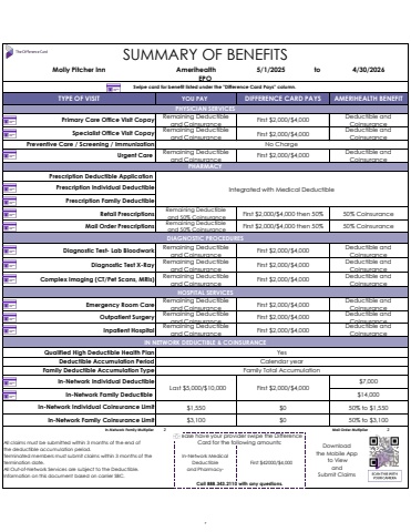 5/1/2025 toIn-Network Family Multiplier 2 Mail Order Multiplier 2Please have your provider swipe the Difference Card for the following amounts: Download the Mobile App to View and Submit ClaimsAll claims must be submitted within 3 months of the end of the deductible accumulation period.Terminated members must submit claims within 3 months of the termination date.All Out-of-Network Services are subject to the Deductible.Information on this document based on carrier SBC.Call 888.343.2110 with any questions.In-Network Medical Deductibleand PharmacyFirst $42000/$4,000In-Network Individual Coinsurance Limit $1,550 $0 50% to $1,550In-Network Family Coinsurance Limit $3,100 $0 50% to $3,100Family Deductible Accumulation Type In-Network Individual Deductible $7,000In-Network Family Deductible $14,000Family Total AccumulationLast $5,000/$10,000 First $2,000/$4,000Inpatient Hospital Remaining Deductible and Coinsurance First $2,000/$4,000Deductible and CoinsuranceIN NETWORK DEDUCTIBLE & COINSURANCEQualified High Deductible Health Plan YesDeductible Accumulation Period Calendar yearHOSPITAL SERVICESEmergency Room Care Remaining Deductible and Coinsurance First $2,000/$4,000Deductible and CoinsuranceOutpatient Surgery Remaining Deductible and Coinsurance First $2,000/$4,000Deductible and CoinsuranceDiagnostic Test- Lab Bloodwork Remaining Deductible and Coinsurance First $2,000/$4,000Deductible and CoinsuranceDiagnostic Test X-Ray Remaining Deductible and Coinsurance First $2,000/$4,000Deductible and CoinsuranceComplex Imaging (CT/Pet Scans, MRIs) Remaining Deductible and Coinsurance First $2,000/$4,000Deductible and CoinsuranceRetail Prescriptions Remaining Deductible and 50% Coinsurance First $2,000/$4,000 then 50% 50% CoinsuranceMail Order Prescriptions Remaining Deductible and 50% Coinsurance First $2,000/$4,000 then 50% 50% CoinsuranceDIAGNOSTIC PROCEDURESPHYSICIAN SERVICESPrimary Care Office Visit Copay Remaining Deductible and Coinsurance First $2,000/$4,000Deductible and CoinsurancePHARMACYPrescription Deductible Application Prescription Individual DeductiblePrescription Family DeductibleIntegrated with Medical DeductibleSpecialist Office Visit Copay Remaining Deductible and Coinsurance First $2,000/$4,000Deductible and CoinsurancePreventive Care / Screening / Immunization No ChargeUrgent Care Remaining Deductible and Coinsurance First $2,000/$4,000Deductible and CoinsuranceSUMMARY OF BENEFITSMolly Pitcher Inn Amerihealth 4/30/2026EPO Swipe card for benefit listed under the \TYPE OF VISIT YOU PAY DIFFERENCE CARD PAYS AMERIHEALTH BENEFIT7