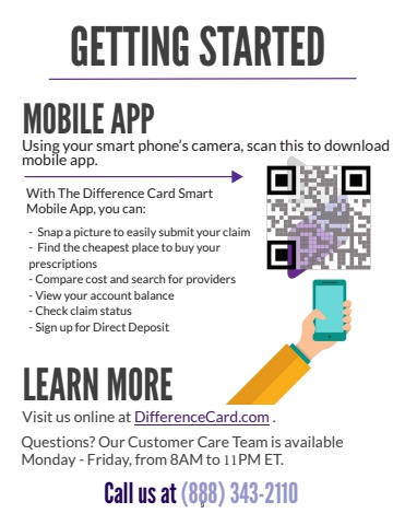 GETTING STARTED With The Difference Card Smart Mobile App, you can: MOBILE APP Using your smart phone%u2019s camera, scan this to download mobile app. - Snap a picture to easily submit your claim- Find the cheapest place to buy yourprescriptions- Compare cost and search for providers- View your account balance- Check claim status- Sign up for Direct DepositLEARN MORE Visit us online at DifferenceCard.com .Questions? Our Customer Care Team is available Monday - Friday, from 8AM to 11PM ET. Call us at (888) 343-21109