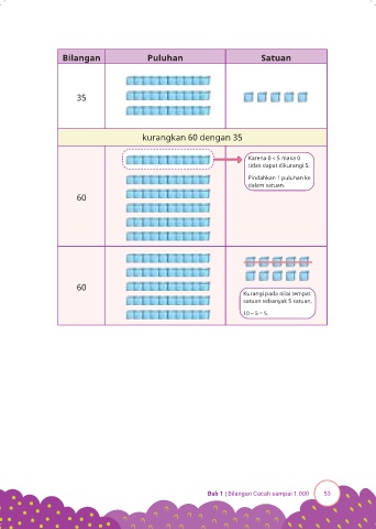 Bilangan Puluhan Satuan 35 kurangkan 60 dengan 35 Karena 0 < 5 maka 0 tidak dapat dikurangi 5. Pindahkan 1 puluhan ke dalam satuan. 60 60 Kurangi pada nilai tempat satuan sebanyak 5 satuan, 10 – 5 = 5. Bab 1 | Bilangan Cacah sampai 1.000 53
