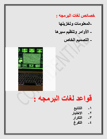 خصائص لغات البرمجه : -المعلومات وتخزينها -الأوامر وتنظيم سيرها -التصميم الخاص قواعد لغات البرمجه : التتابع -1 الاختبار -2 التكرار -3 التفرغ -4