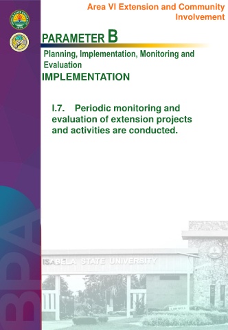 Area VI Extension and Community Involvement PARAMETER B Planning, Implementation, Monitoring and Evaluation IMPLEMENTATION I.7. Periodic monitoring and evaluation of extension projects and activities are conducted.
