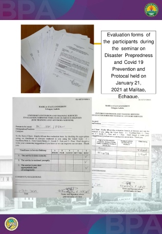 Evaluation forms of the participants during the seminar on Disaster Prepredness and Covid 19 Prevention and Protocal held on January 21, 2021 at Malitao, Echague,