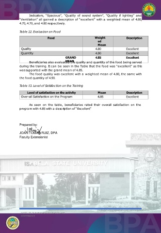 during the training. It can be seen in the Table that the food was “excellent” as this