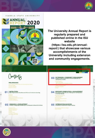 The University Annual Report is regularly prepared and published online in the ISU website (https://isu.edu.ph/annual- report/) that showcase various accomplishments of the University including extension and community engagements.