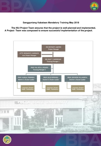 Sangguniang Kabataan Mandatory Training May 2018 The ISU Project Team ensures that the project is well-planned and implemented. A Project Team was composed to ensure successful implementation of the project.
