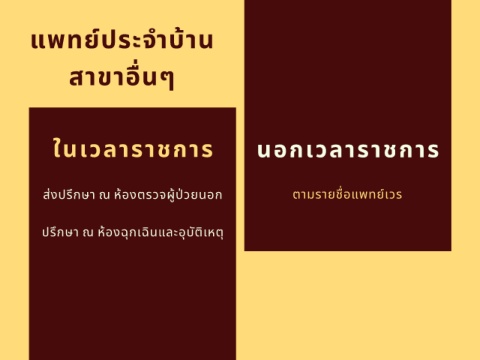 แพทย์ประจําบ้าน สาขาอนๆ ื ในเวลาราชการ นอกเวลาราชการ ส่งปรึกษา ณ ห้องตรวจผู้ป วยนอก ตามรายชื อแพทย์เวร ุ ิ ปรึกษา ณ ห้องฉุกเฉนและอบัตเหตุ ิ