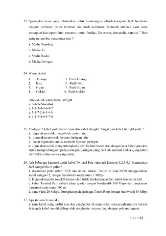 26. Ada beberapa kategori untuk kabel Twisted Pair yaitu ada kategori 1,2,3,4,5. Kegunakan