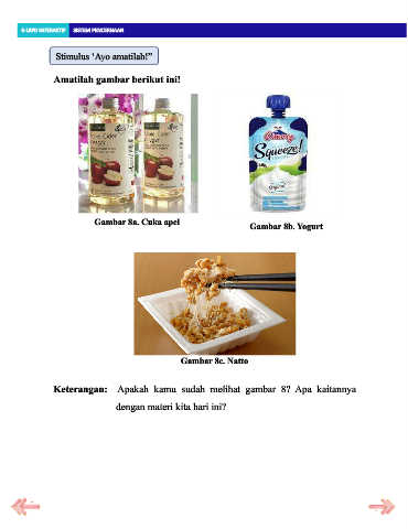 T E M S I S N C E P E E-LKPD INTERAKTIF RNAAN Stimulus ‘Ayo amatilah!” Amatilah gambar berikut ini! Gambar 8a. Cuka apel Gambar 8b. Yogurt Gambar 8c. Natto Keterangan: Apakah kamu sudah melihat gambar 8? Apa kaitannya dengan materi kita hari ini?