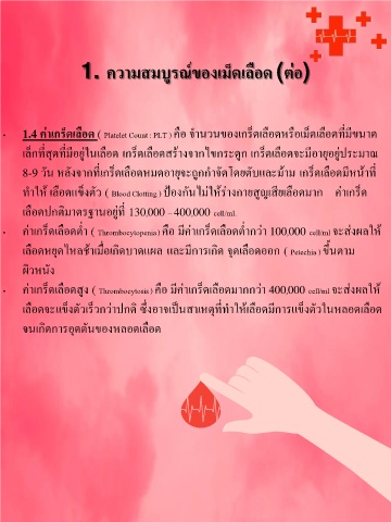 • 1.4 คาเกร็ดเลือด ( Platelet Count : PLT ) คือ จํานวนของเกร็ดเลือดหรือเม็ดเลือดที่มีขนาด