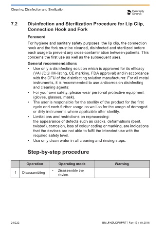 7.2 Disinfection and Sterilization Procedure for Lip Clip, Operation Operating mode Warning