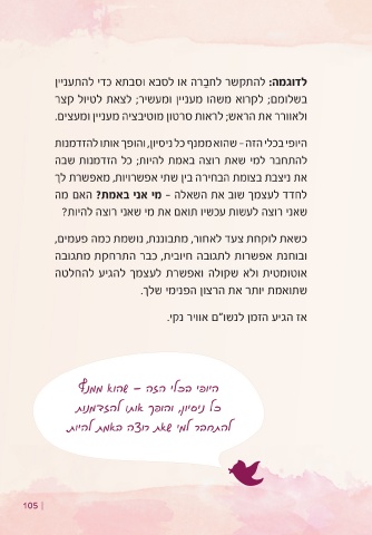 ןיינעתהל ידכ אתבסו אבסל וא הר ֵבחל רשקתהל :המגודל   :ךמצעל רמולו ןמז קחרממ הב ןנובתהל ילכותש הלועפ לע   בושחל יסנ .תמאב ךמצעל תרבוחמ תויהל ידכ תושעל ןכ   המ רקיעב אלא ,תושעל אל המ קר אל איה האירב הבוגת   ?תויהל הצור תייהש םדאל ?הצור תמאב תאש המְל וי