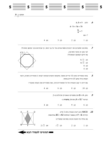 5 5 42 4 = ? 5 5 .ר"מס 10 115° (3) 110° (2) 125° (4) 105° (1) (20 18 תולאש) תויעבו תולאש 5 5 ?y לש וכרע תויהל לוכי םיאבהמ המ ,טוטרסבש םינותנהו הלא םינותנ יפ לע 5 5 C .טוטרסבכ ,לגעמב םוסחה (AB = AC) םייקוש הווש שלושמ אוה ABC .18 75° A 5 5 D B וחטשש תיווז רשי שלושמ תורצויה ,C(x,y) ו B(7,3) ,A(3,3) תודוקנה ונמוס םיריצ תכרעמ יבג לע .19 5 5 6 6 אבה דומעל וכישמה the Eighteenth Ce