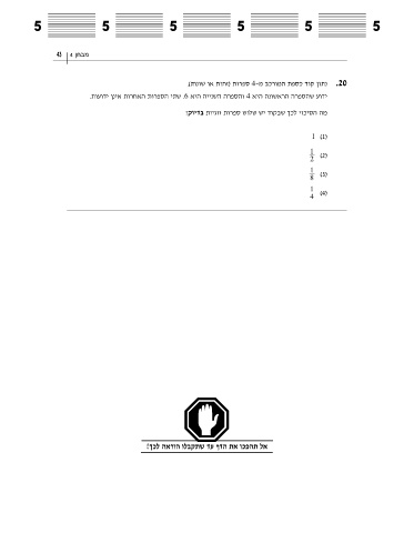 5 5 38 .5 .4 .3 .2 .1 4 :ןותנ 5 45° (4) 36° (3) 25° (2) 18° (1) 3 5 .םלש רפסמ x 2 | x | + 7 < 10 x < x 0 (2) 2x (2) (12 1 תולאש) תויעבו תולאש 120 (2) 5 5 ,טוטרסבש םינותנהו הלא םינותנ יפל ?ןויווש יאל שי םיירשפא תונורתפ המכ 1 (3) x (3) 150 (3) ?רתויב לודגה אוה םיאבה םייוטיבהמ הזיא .הירבחמ תונתמ יביל הלביק התדלוה םוי דובכ