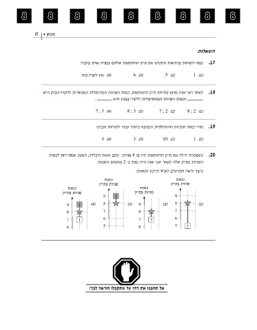 8 8 8 8 62 .4 .3 .2 .1 8 8 8 8 4 ? 2 3 (2) 7 (3) 50 (4) 15 (1) 40 (4) 36 (3) 50 (2) 55 (1) 19 (4) 22 (3) 18 (1) 1 = 20 (2) 1 : 9 (4) 1 : 3 (3) 1 : 1 (1) : 1 + 8 8 82 7 (2) ^ (16 1 תולאש) תויעבו תולאש ?(םילקשב) הציפה ריחמ המ 8 8 .תוקד 100 ב דחא רדח תדייסמ תינליא ?םירדח 12 תינליא דייסת תועש המכ ךותב 8 8 .םילקש 60 לאירא םלי