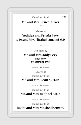 songs for Shabbos, especially those which his wife loves to Mr. and Mrs. Jody Levy