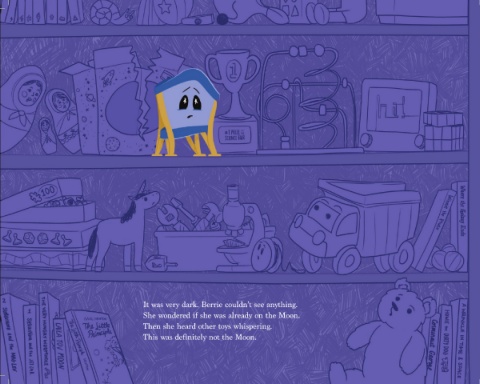 It was very dark. Berrie couldn’t see anything. dreamed of. The little spacecraft hoped her new friend could help her get to the place she had always But that day a little girl named Maya picked her up off the shelf and brought her home. Berrie was nervous. She didn’t know if the children had “Space is for big rockets,” he growled. the darkness. He towered over Berrie. Just then, a great big rocket appeared out of