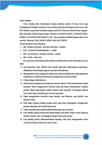 bersangkutan bertempat. Penulisan scene heading selalu diawali dengan nomer scene, lalu