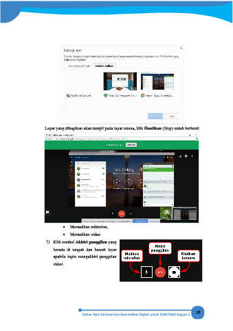Layar yang dibagikan akan tampil pada layar utama, klik Hentikan (Stop) untuk berhenti. • Mematikan mikrofon, • Mematikan video. 7) Klik tombol Akhiri panggilan yang berada di tengah dan bawah layar apabila ingin mengakhiri panggilan video. 35