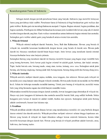 fauna yang jumlahnya tidak sedikit. Persebaran fauna di Indonesia di bagi berdasarkan garis wallace dan