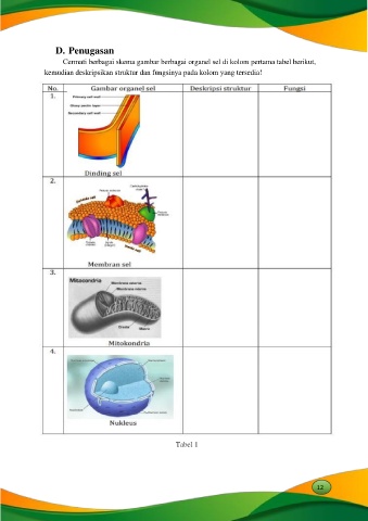 D. Penugasan Cermati berbagai skema gambar berbagai organel sel di kolom pertama tabel berikut, kemudian deskripsikan struktur dan fungsinya pada kolom yang tersedia! Tabel 1 12