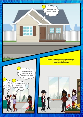 4 Sampai jumpa teman-teman. Tokoh sedang mengerjakan tugas video pembelajaran. 1 Akhirnya selesai tugas kita. Kalian mau langsung balik? 3 2 Iya Vi, Iya nih Vi. Aku sampai dan Beni jumpa Vi. pulang dulu ya.
