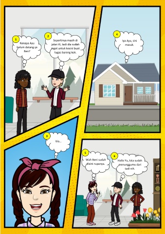 4 2 1 Sepertinya masih di Iya Ayu, sini Kenapa Ayu jalan Vi, tadi dia sudah masuk. belum datang ya ingat untuk kesini buat Ben? tugas bareng kok. 3 Vio… 5 6 Wah Beni sudah Hallo Yu, kita sudah disini rupanya. menunggumu dari tadi nih.