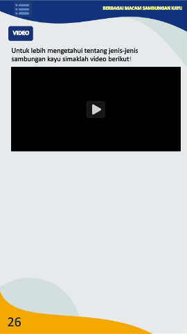 BERBAGAI MACAM SAMBUNGAN KAYU VIDEO Untuk lebih mengetahui tentang jenis-jenis sambungan kayu simaklah video berikut! 26