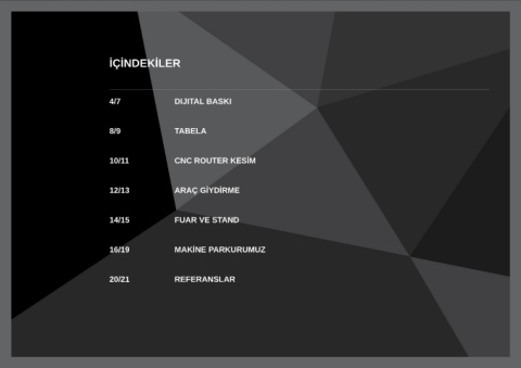 İÇİNDEKİLER 4/7 DIJITAL BASKI 8/9 TABELA 10/11 CNC ROUTER KESİM 12/13 ARAÇ GİYDİRME 14/15 FUAR VE STAND 16/19 MAKİNE PARKURUMUZ 20/21 REFERANSLAR