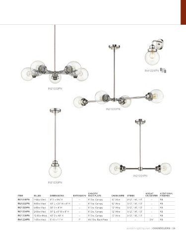 ITEM BULBS DIMENSIONS EXTENSION BACK PLATE CHAIN/WIRE STEMS ON CENTER FINISHES