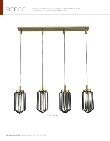 REECE Metal cages complement the aged brass finish. Reece might have come from your neighborhood mechanic’s shop. IN31502AB 30 | CHANDELIERS | ACCLAIM LIGHTING | 866-845-5451