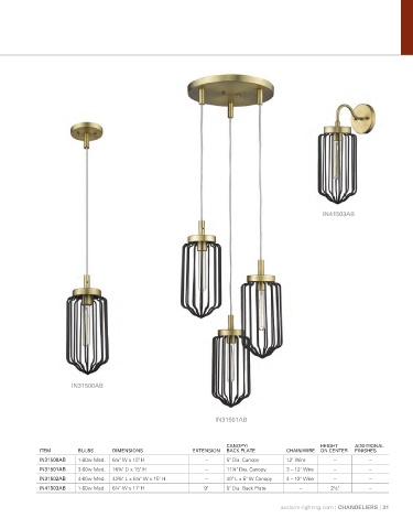 ITEM BULBS DIMENSIONS EXTENSION BACK PLATE CHAIN/WIRE ON CENTER FINISHES