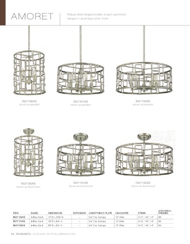 ITEM BULBS DIMENSIONS EXTENSION CANOPY/BACK PLATE CHAIN/WIRE STEMS FINISHES