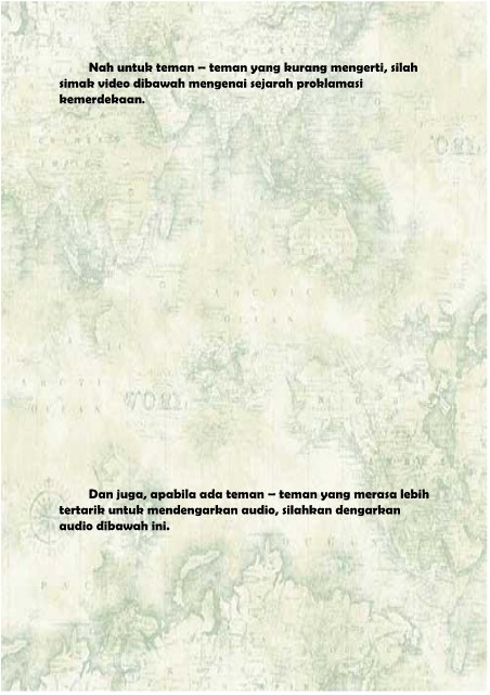 Nah untuk teman – teman yang kurang mengerti, silah simak video dibawah mengenai sejarah proklamasi kemerdekaan. Dan juga, apabila ada teman – teman yang merasa lebih tertarik untuk mendengarkan audio, silahkan dengarkan audio dibawah ini.