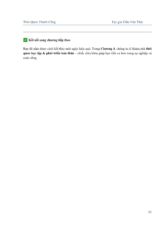 Bạn đã nắm được cách kết thúc một ngày hiệu quả. Trong Chương 4, chúng ta sẽ khám phá thói