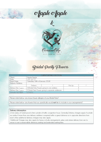 Additional Charges may also apply for heavy or bulky arrangements, glass and where delivery from van to venue is over a reasonable distance, parking and extended waiting fees.