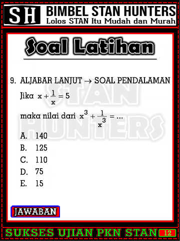 9. ALJABAR LANJUT SOAL PENDALAMAN Jika x 1 5 x maka nilai dari x 3 1 ... x 3 A. 140 B. 125 C. 110 D. 75 E. 15 12