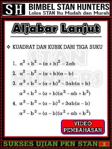 KUADRAT DAN KUBIK DARI TIGA SUKU 2 2 1. a b 2 (a b) 2ab 2 2. a b 2 (a b)(a b) 3 3 3. a b 3 (a b) 3ab(a b) 2 2 3 a b 3 (a b)(a ab b ) 3 3 4. a b 3 (a b) 3ab(a b) 2 2 3 a b 3 (a b)(a ab b ) 2